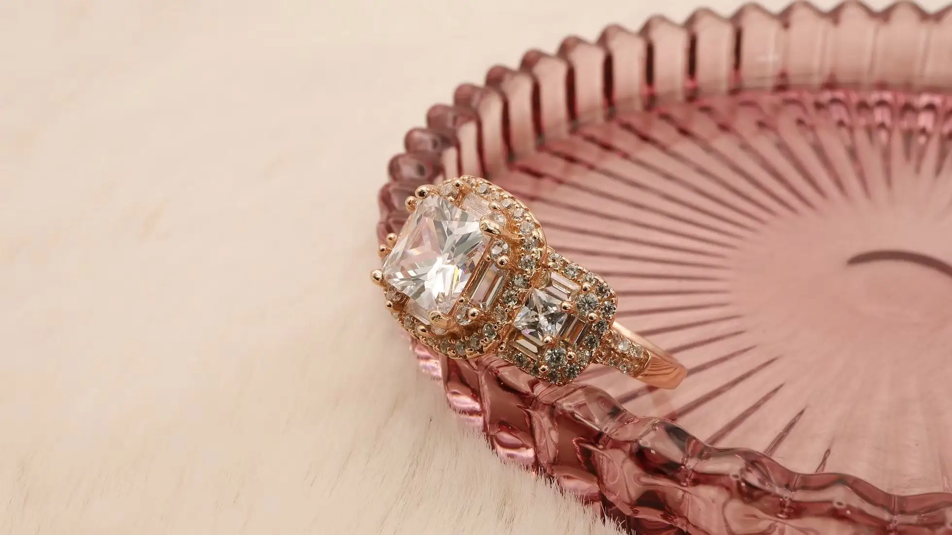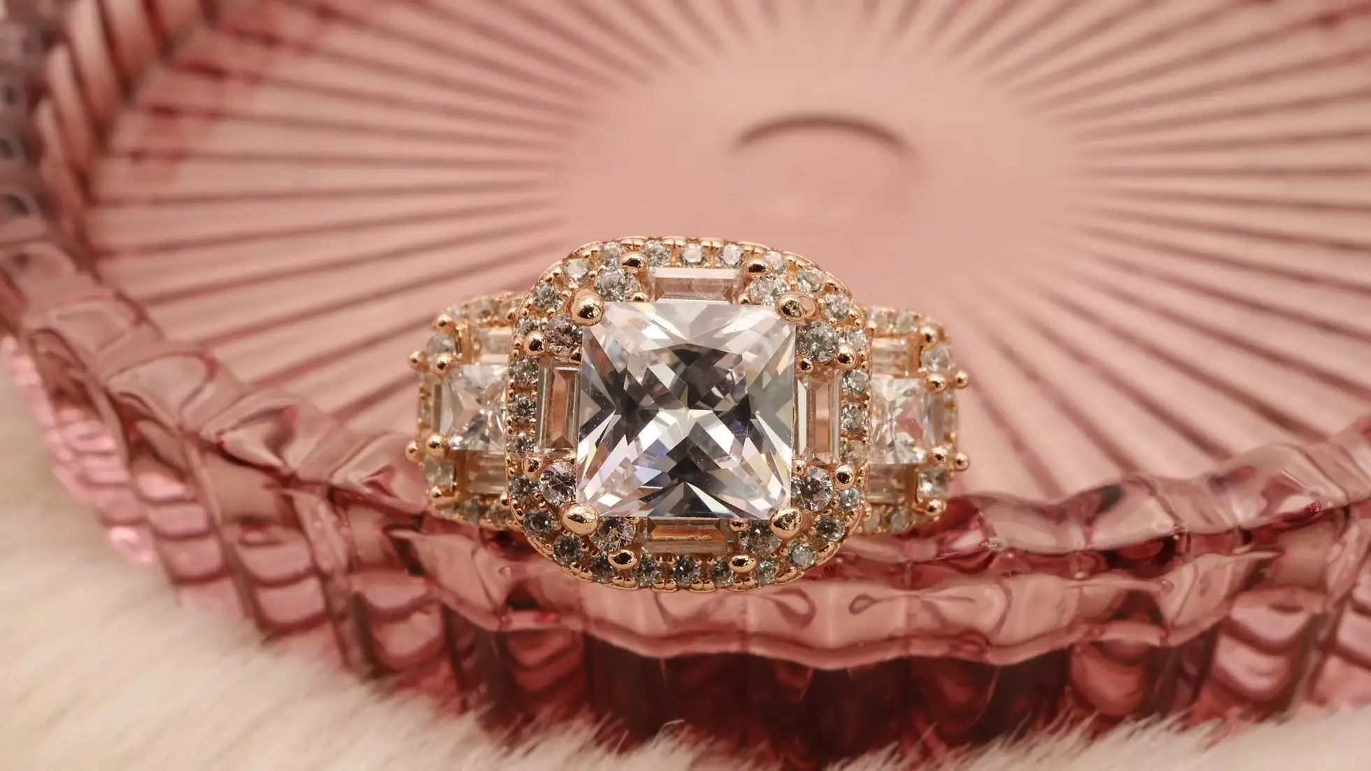 Der Majestic Rosé Ring vereint Eleganz und Anmut in einem kunstvollen Design. Drei quadratische Zirkonia-Edelsteine in Roségold strahlen im Zentrum des Rings, wobei der mittlere Stein majestätisch erhöht ist. Umringt von funkelnden, kleineren runden Zirkoniasteinen und flankiert von rechteckigen Akzenten auf jeder Seite, ist dieser Ring ein Meisterwerk aus 925er-Silber mit einer edlen Rosévergoldung. Ein harmonisches Zusammenspiel von Form und Glanz, das den perfekten Akzent für jeden Anlass setzt.