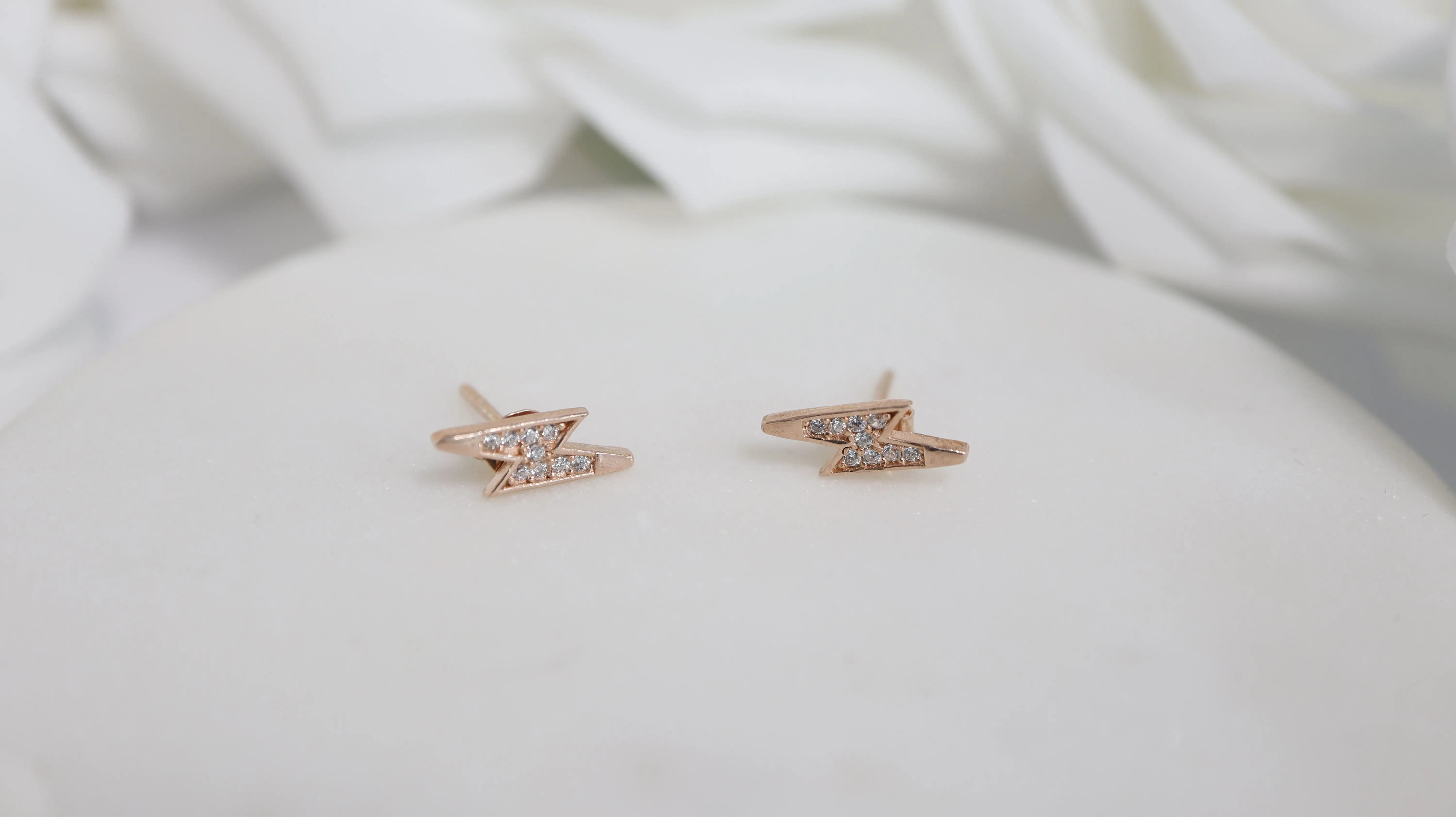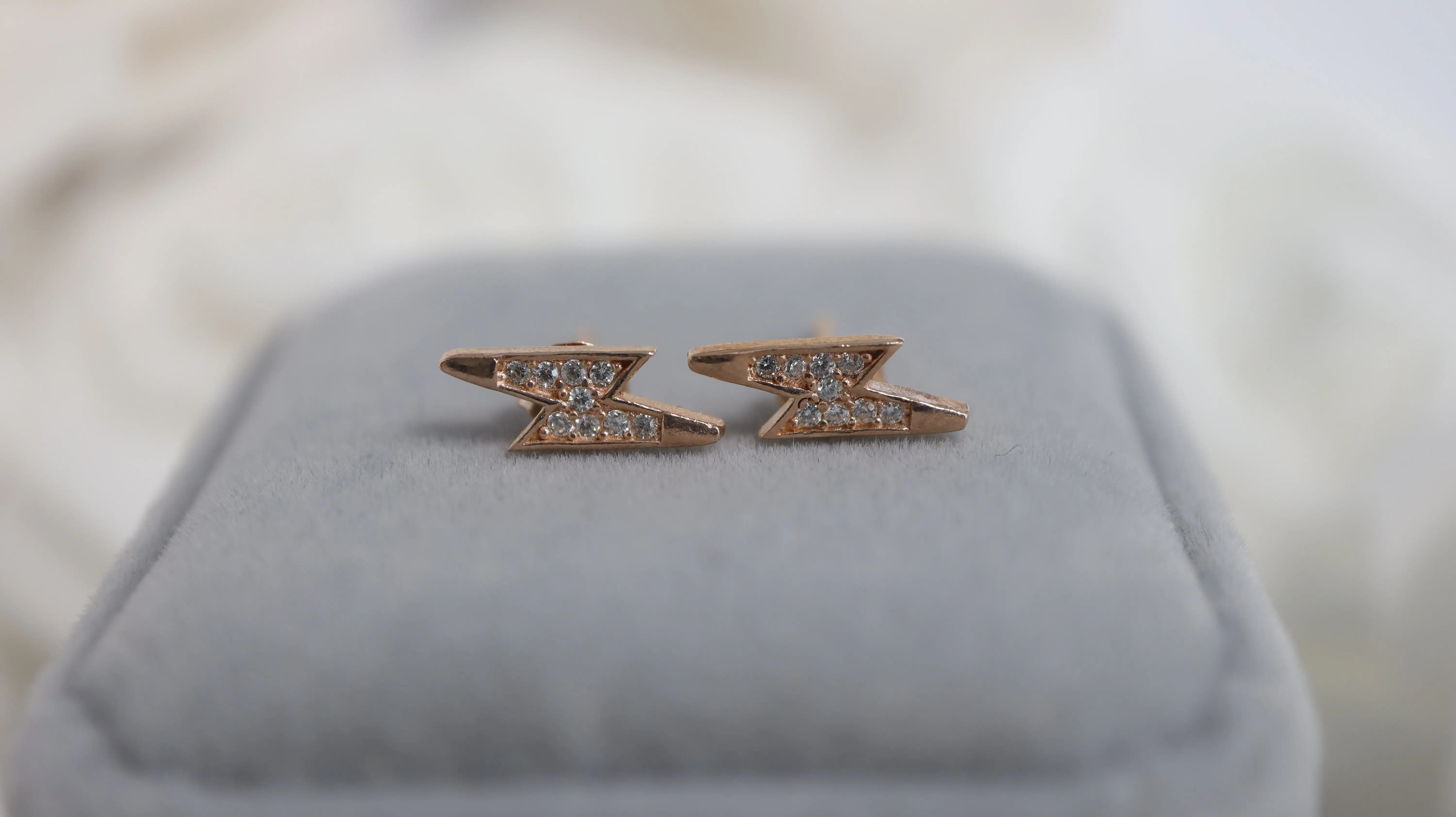 Die „Rose Flash“ Ohrstecker, geformt wie Blitze und aus anmutigem Roségold gefertigt, sind mit funkelnden Zirkonia-Steinen verziert, die das Licht auf elegante Weise einfangen und Ihrem Look eine subtile, aber auffällige Note verleihen. Diese Ohrringe sind der perfekte Ausdruck von modernem Stil und zeitloser Eleganz, ideal, um Ihre Persönlichkeit zu unterstreichen und jedem Auftritt eine strahlende Aura zu verleihen.