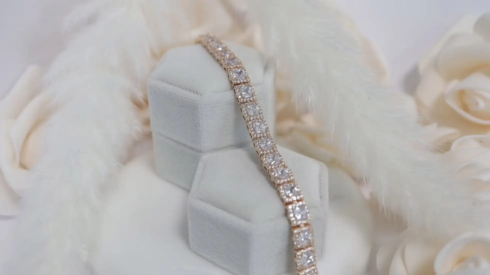 Entdecken Sie die schimmernde Eleganz des „Rosegold Square Sparkle“ Armbands – eine wahrhaft faszinierende Kreation, die die Blicke auf sich zieht. Jedes Glied dieses Armbands besteht aus einem bezaubernden Roségold-Quadrat, das in der Mitte von einem funkelnden Zirkonia-Stein geziert wird. Diese großen Steine strahlen in ihrem eigenen Glanz und verleihen jedem Quadrat eine einzigartige Brillanz.