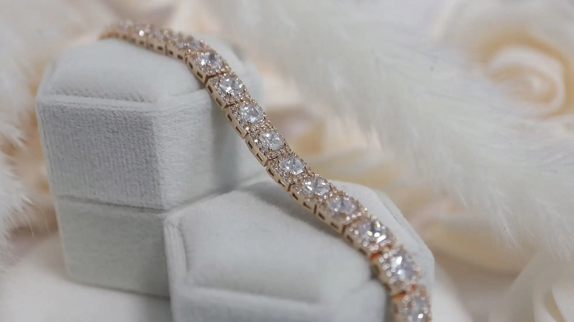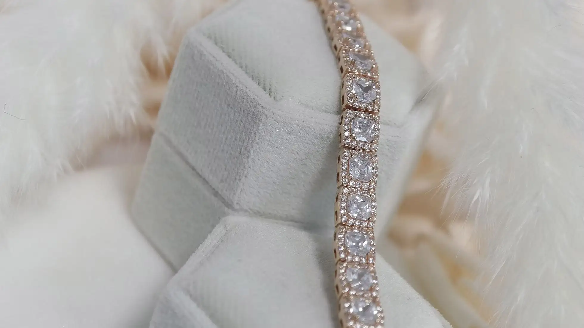 Doch das ist nicht alles – der Rand jedes Quadrats ist ebenfalls mit einer Reihe von kleinen Zirkonia-Steinen besetzt, die das Armband zum Funkeln bringen und ihm einen zusätzlichen Hauch von Raffinesse verleihen. Jedes Detail wurde mit größter Sorgfalt und Liebe zum Detail gestaltet, um Ihnen ein Schmuckstück von höchster Qualität zu bieten.